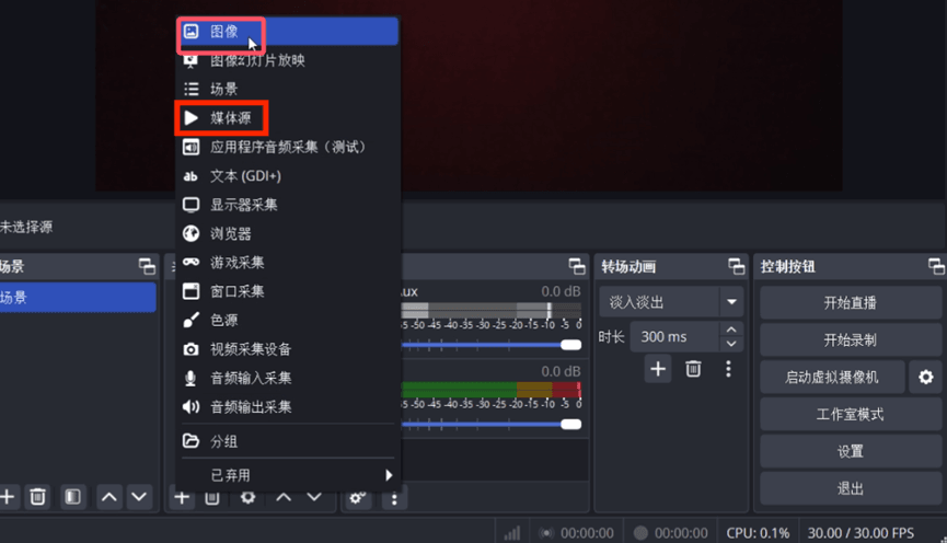 在“来源”面板中,再次点击左下角的“+”号按钮,选择“图像”或“媒体源”以添加背景。