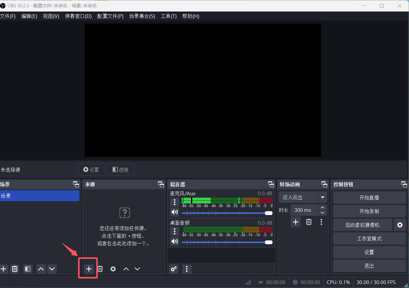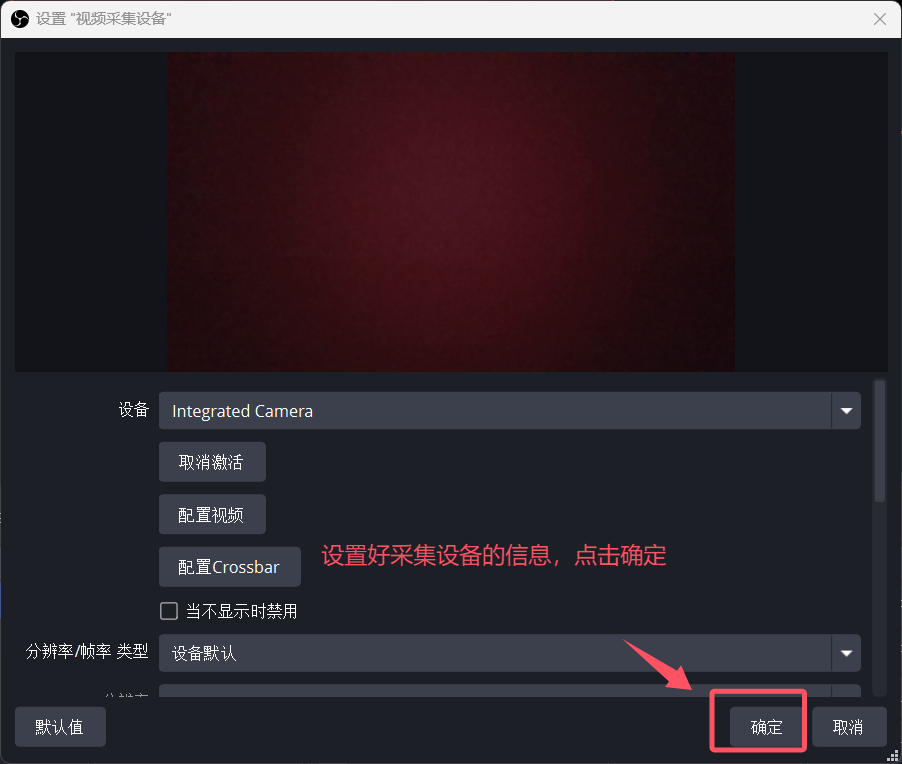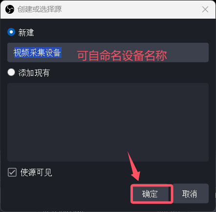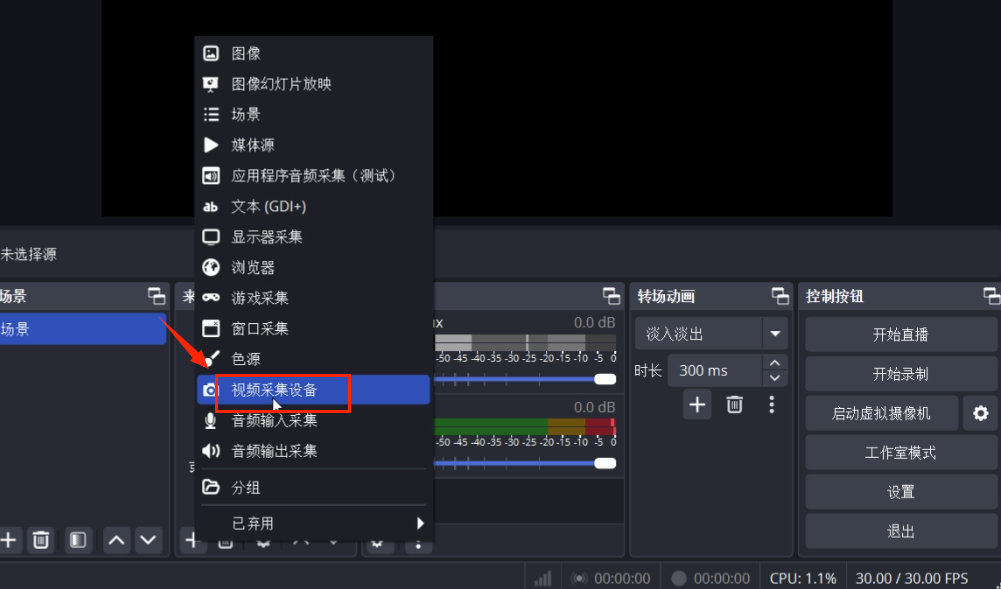 (1)在底部「来源」框里点「+」→ 选「视频采集设备」