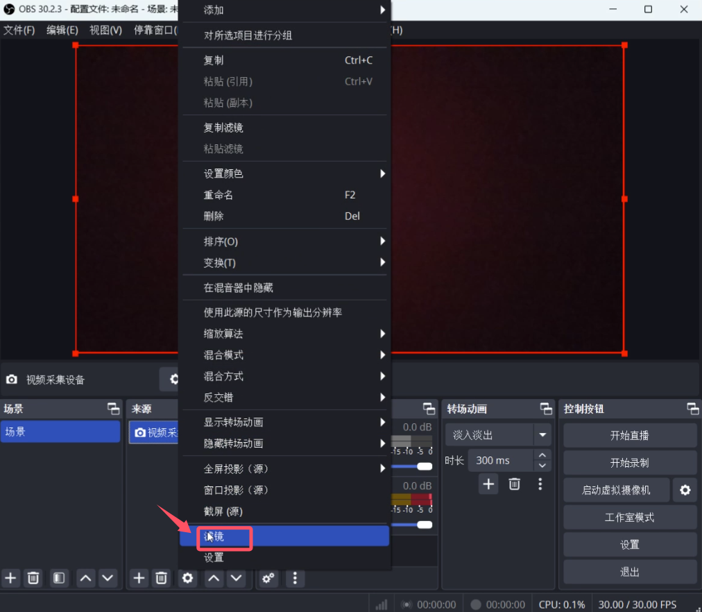 右键点击视频采集设备的实时画面,选择“滤镜”。