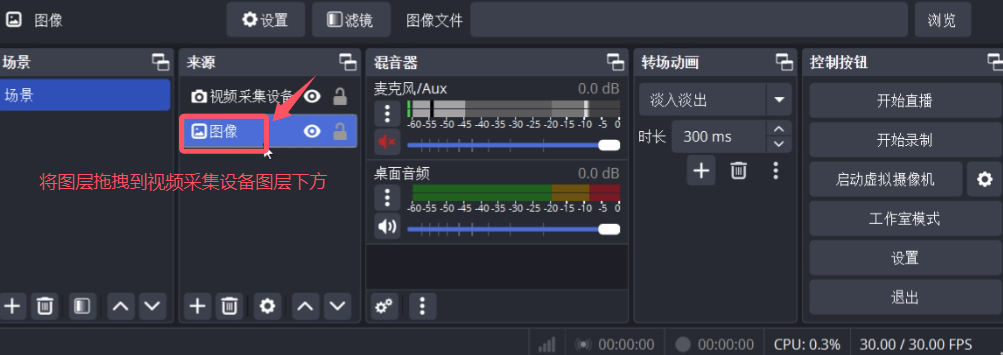 在“来源”列表中,将新添加的背景图层拖拽到视频采集设备图层的下方。这样,人像就会显示在背景的前面。